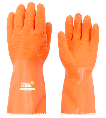 Luva de segurança confeccionada em forro de fibras naturais tipo interlock, totalmente revestida em látex corrugado na palma, pontas dos dedos e dorso, látex liso no punho.